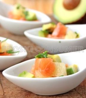 Marinatuaren zuku pixka batekin, arindu maionesa, eta jarri zerbitzatzeko koilaratxo batzuen oinarrian. Maionesaren gainean izokin marinatu eta xukatua jartzen dugu, aguakate eta anana zatitxoekin batera. Tipulin fresko zatitxo batzuekin eta oliba-olio birjina estraren tanta batzuekin apainduko dugu.